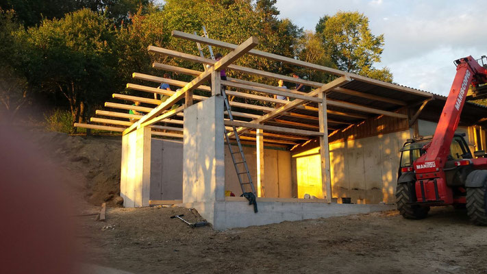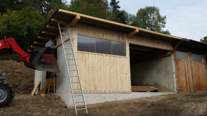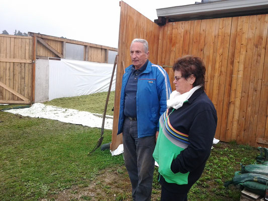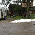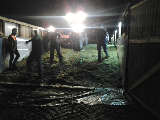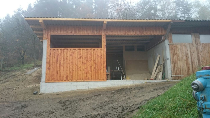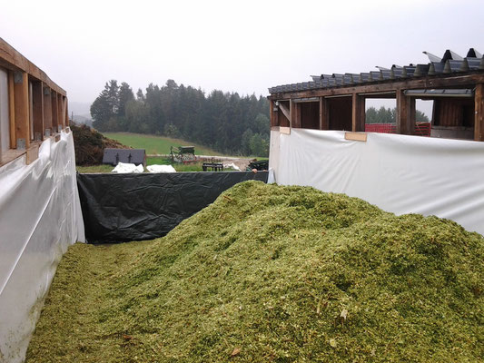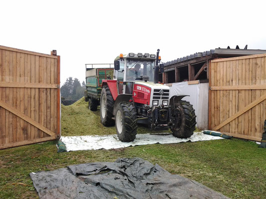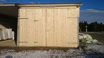 04/2015 Die Stürme der letzten Zeit haben auch bei uns Spuren und Schäden hinterlassen. Daher haben wir uns entschieden unsere Fahrsilosanlage windgeschützter auszubilden. Neue selbstgemachte Tore auf der Ostseite mit integrierter Tür sollten die Futtervorräte künftig vor Unwettern schützen.