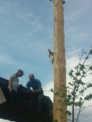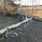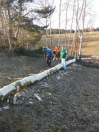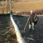 Wir haben eine große Fichte geschlägert, geschält und zum Trocknen gelagert. Sie hat nun eine Länge von ca. 20 Meter.