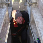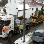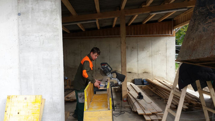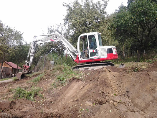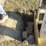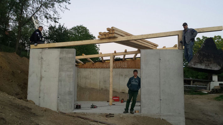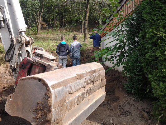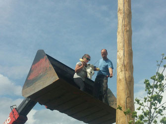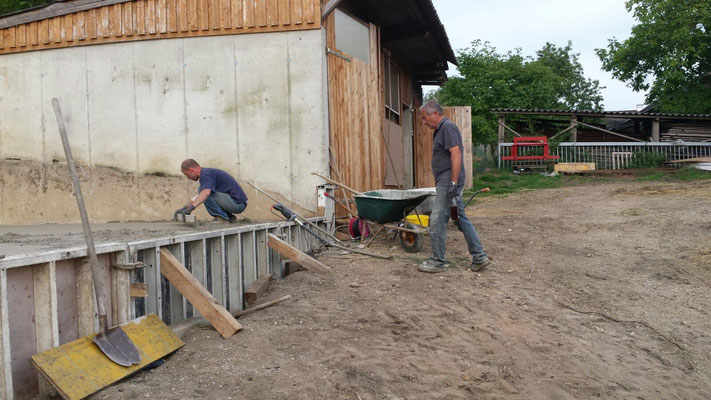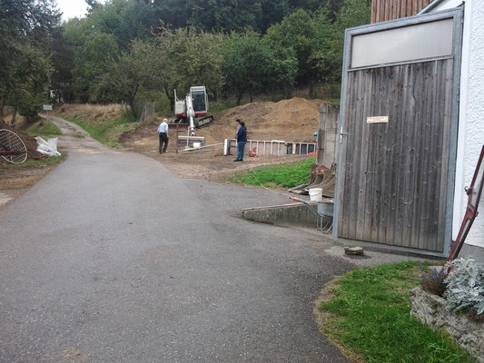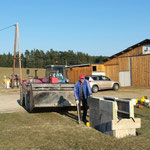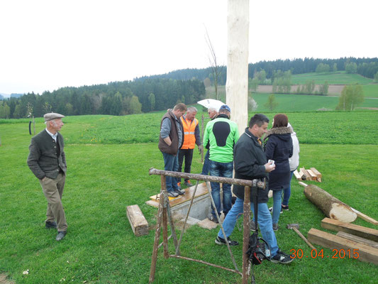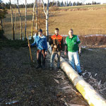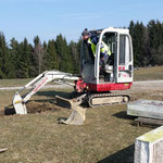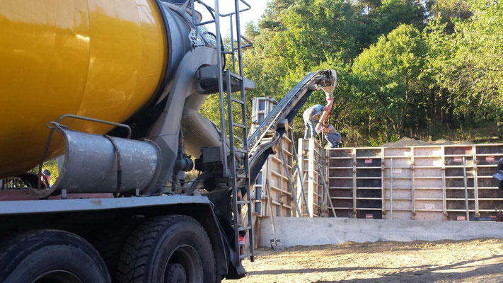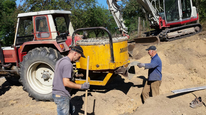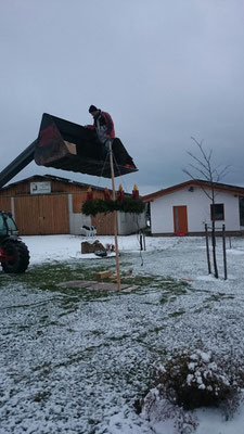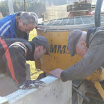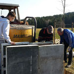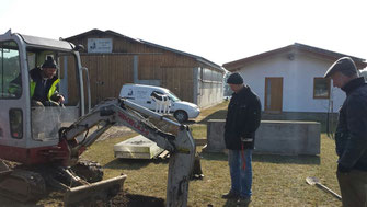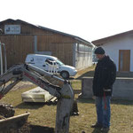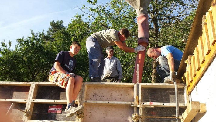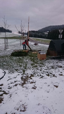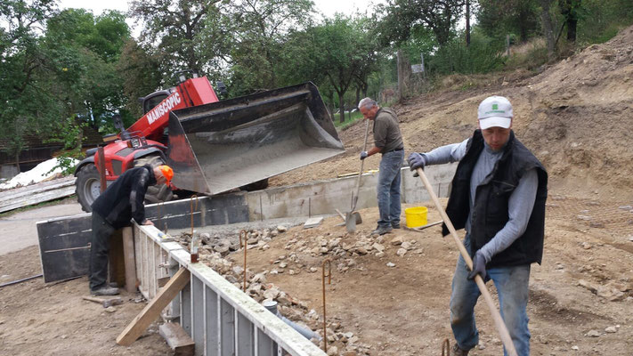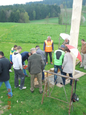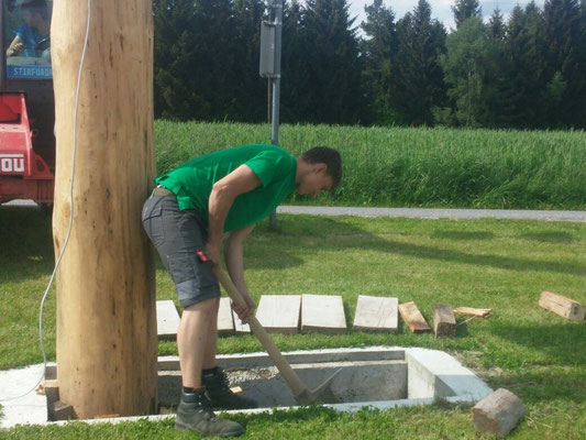 Mit einem Minibagger hat uns unser Nachbar ein tiefes Erdloch gegraben. Dort wird nun ein Betonfundament für unser zukünftigen Maibäume errichtet. Danach betonierten wir die Seitenwände und eine Treppe zu sicheren Verankerung der Bäume.