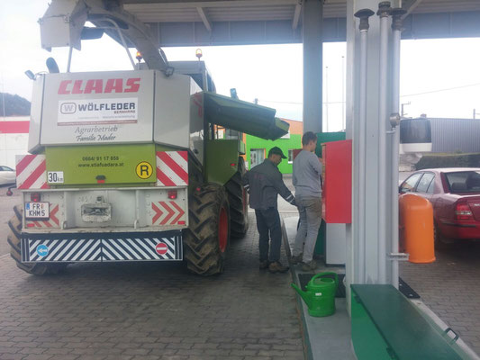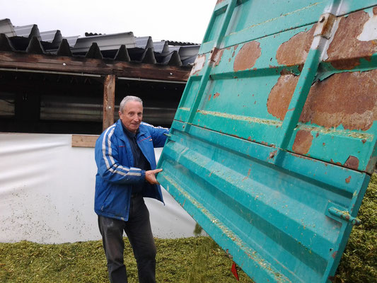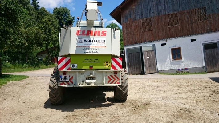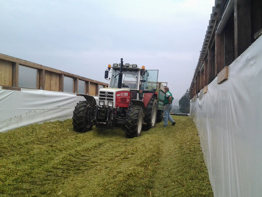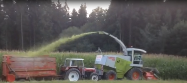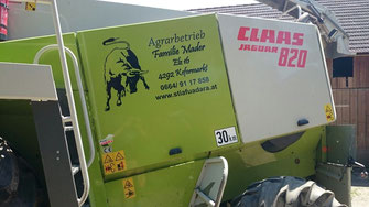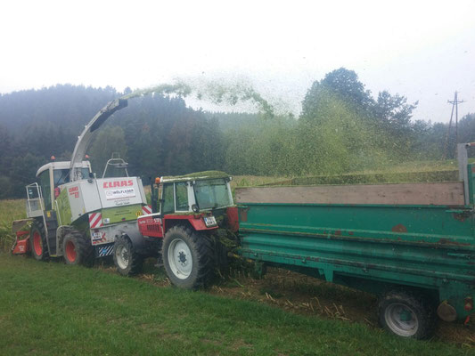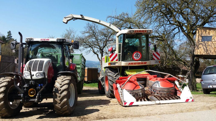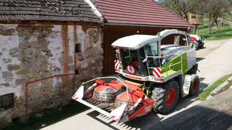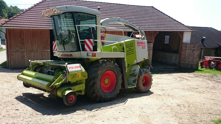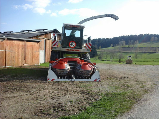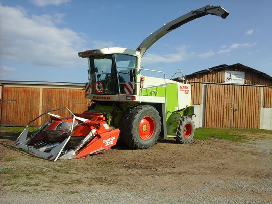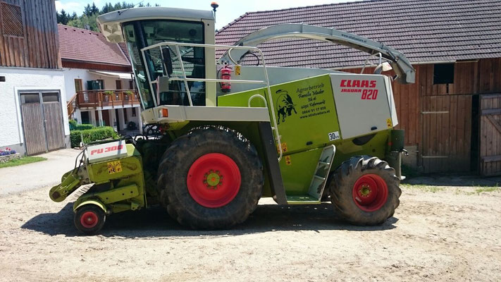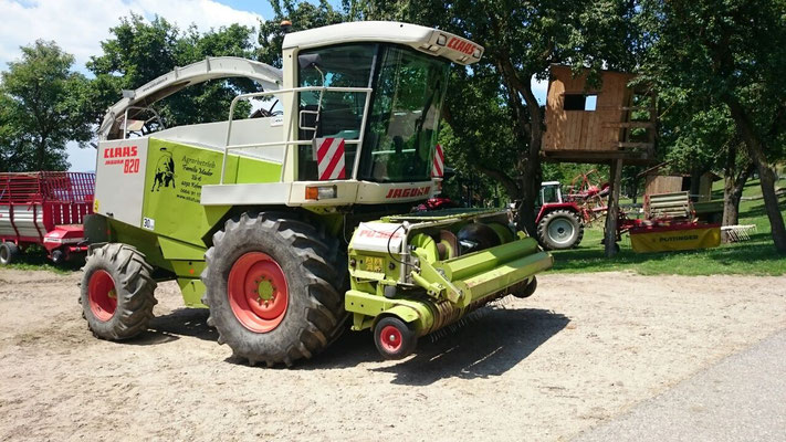 Nach langen Überlegungen haben wir uns entschieden, einen Selbstfahrer anzuschaffen. Ein Claas Jaguar 820 wurde über die Fa. Wölfeder gekauft. Ausgestattet mit einem Mercedes V6 Motor mit einer Leistung von 320 PS, einem 4reihen reihenlos Maisgebiss und einer Pickup PU300 kann jetzt Mais und Gras gehäckselt werden.